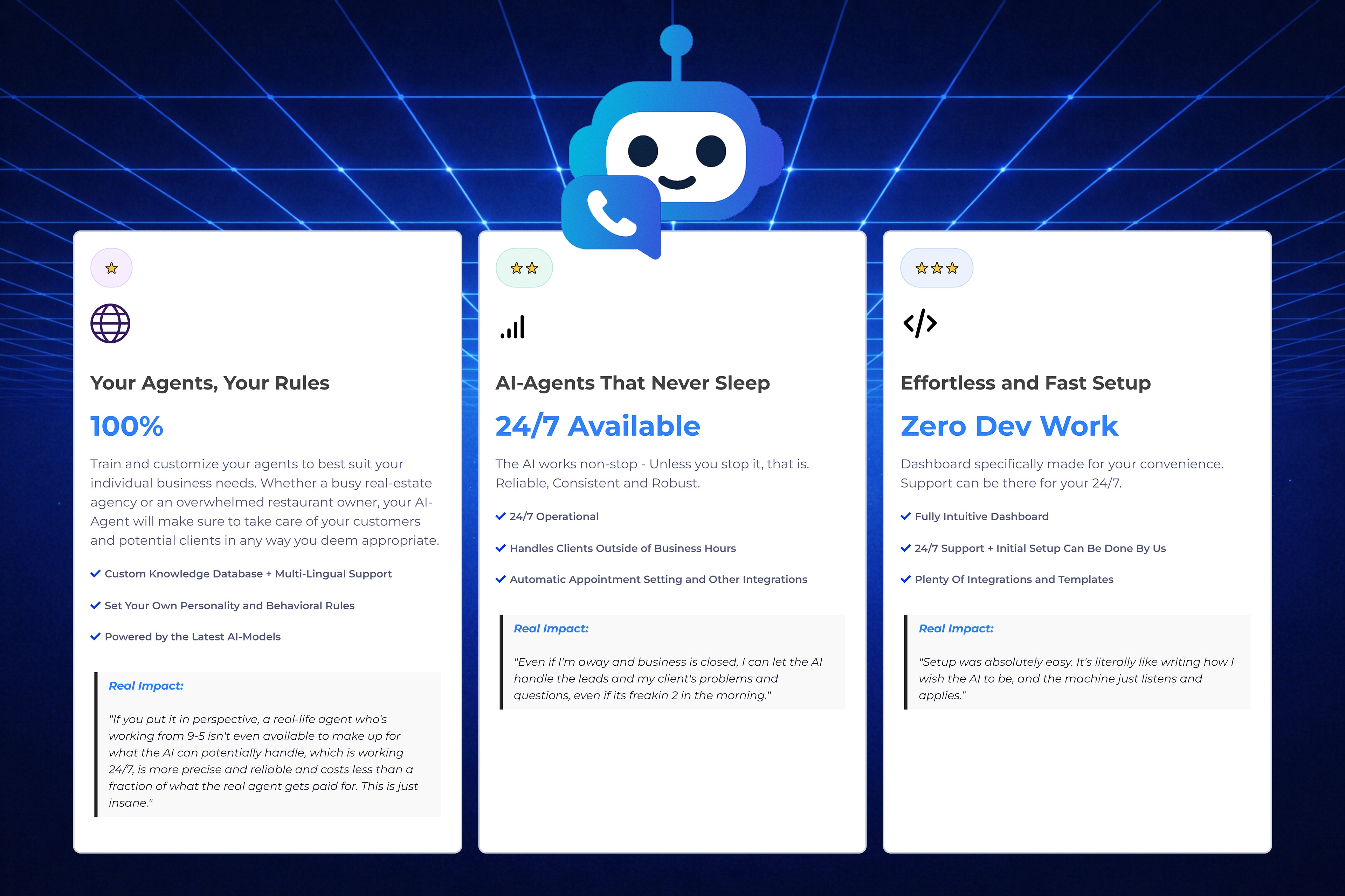 With the AI agent, you can leverage a tool that can work 24/7, while being able to handle multiple calls at the same time, for almost a fraction of the regular pay.